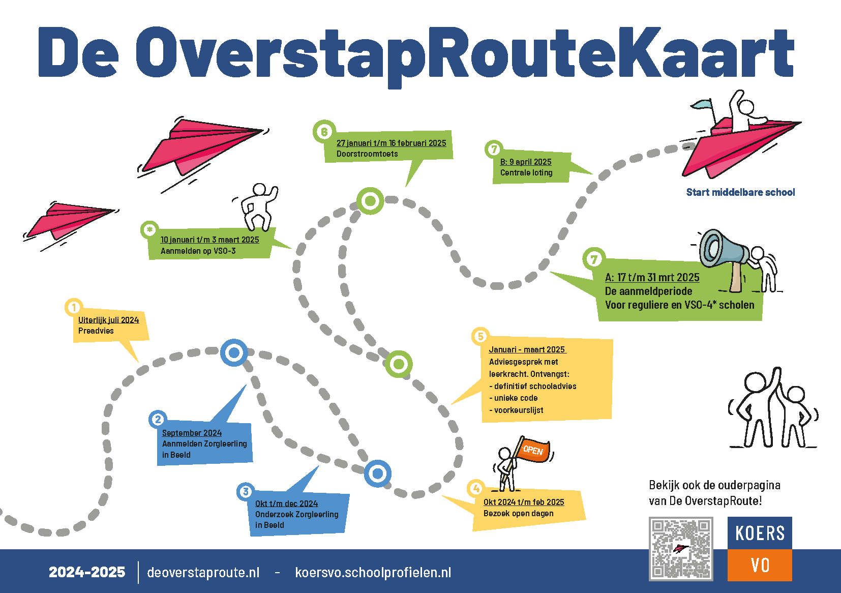 De uitleg van deze routekaart en meer informatie over deze OverstapRoute en wat hierin van basisschool, middelbare school en ouders verwacht wordt vindt u op de website van de OverstapRoute van KoersVO voor ouders, of in dit document
